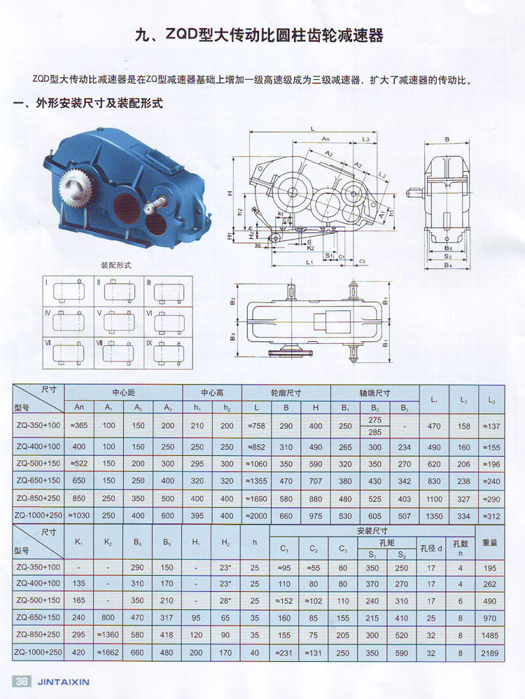產品賣點:1)承載能力高。主要零部件高速軸材料采用42CrMo;大齒輪由齒圈和輪芯組合而成,齒圈材料采用35SiMn,輪芯材料采用HT200°;機蓋、油池由A3鋼板焊接而成;機座采用HT200,承載能力比調質滾齒的軟齒面和中硬齒面齒輪減速器有大幅度提高。