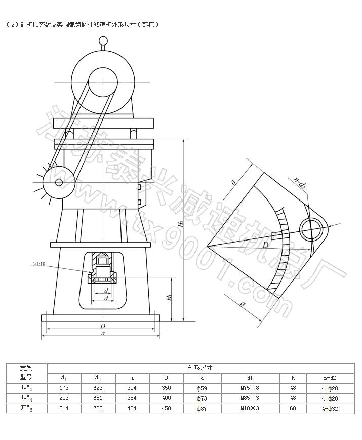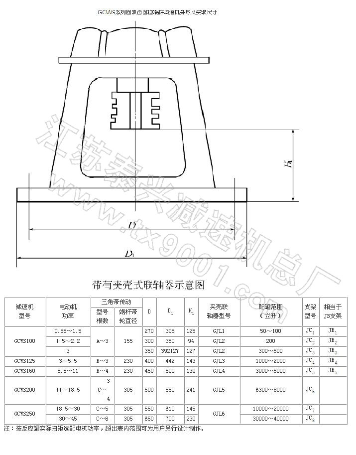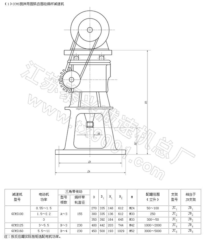 GCWS系列蝸桿減速機采用了軸截面為圓弧形的圓柱蝸桿,蝸輪齒形為與蝸桿相共軛的圓弧,故凸凹嚙合。具有性能可靠,承載能力強,體積小,噪聲低, 運轉平穩(wěn),效率高,密封好等優(yōu)點。主要配套安裝于化工、制藥、造紙、釀酒等容器上作傳動攪拌用。特別與搪玻璃反應罐配套安裝,由于設計采用了直徑較大的蝸 輪軸,并加長了該軸的兩上軸承支撐點距離,改變了原來靠通用支架聯(lián)接三軸一體的傳動攪拌形式為減速機與攪拌器直聯(lián)一體的傳動攪拌形式。從而比同類產品體積 小1/3,承載能力強0.5-1.5倍,傳動效率提高10%-20%。